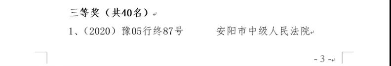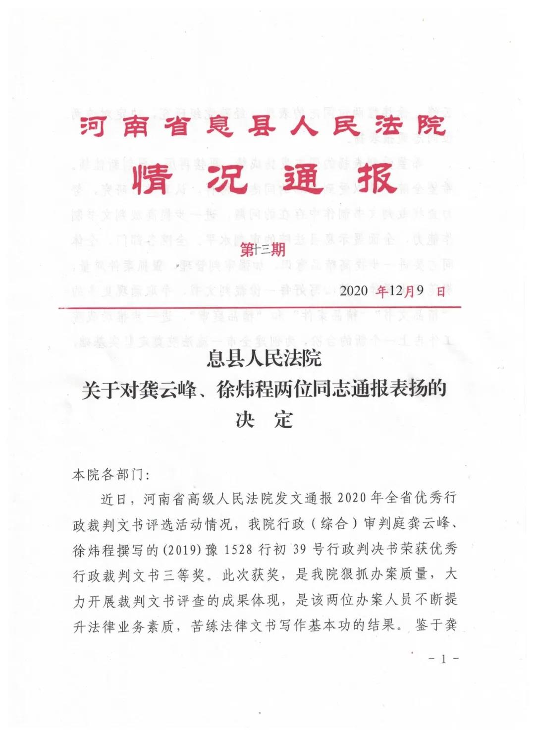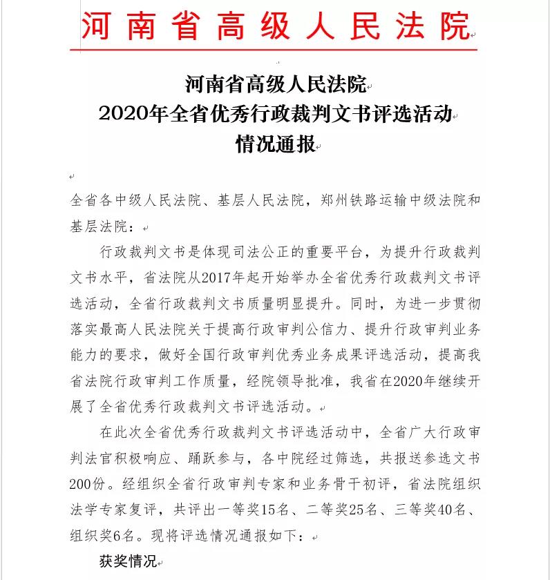 近日,河南省高级人民法院发布2020年全省优秀行政裁判文书评选活动结果,其中,息县人民法院行政综合庭龚云峰、徐炜程撰写的(2019)豫1528行初39号裁判文书荣获三等奖!