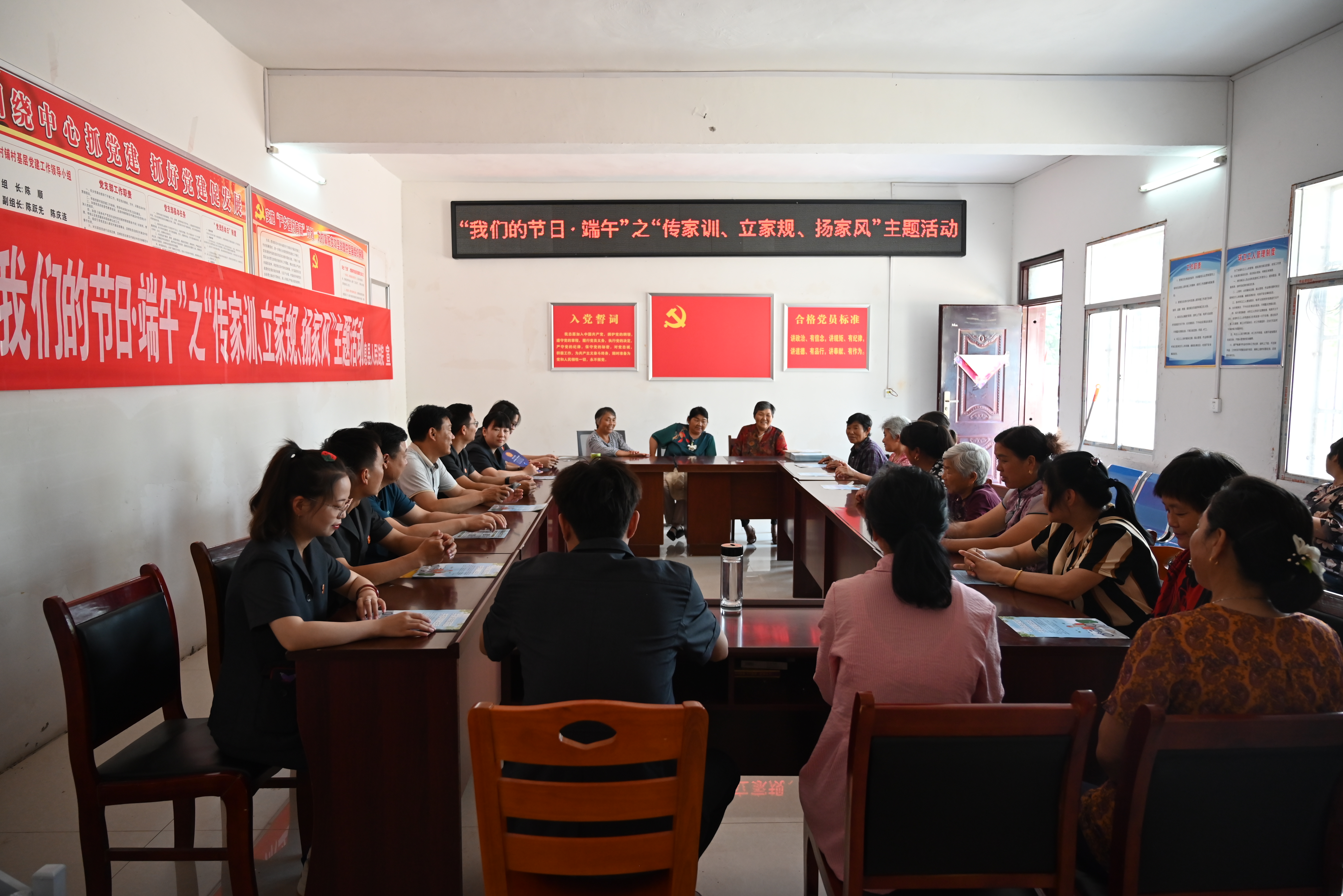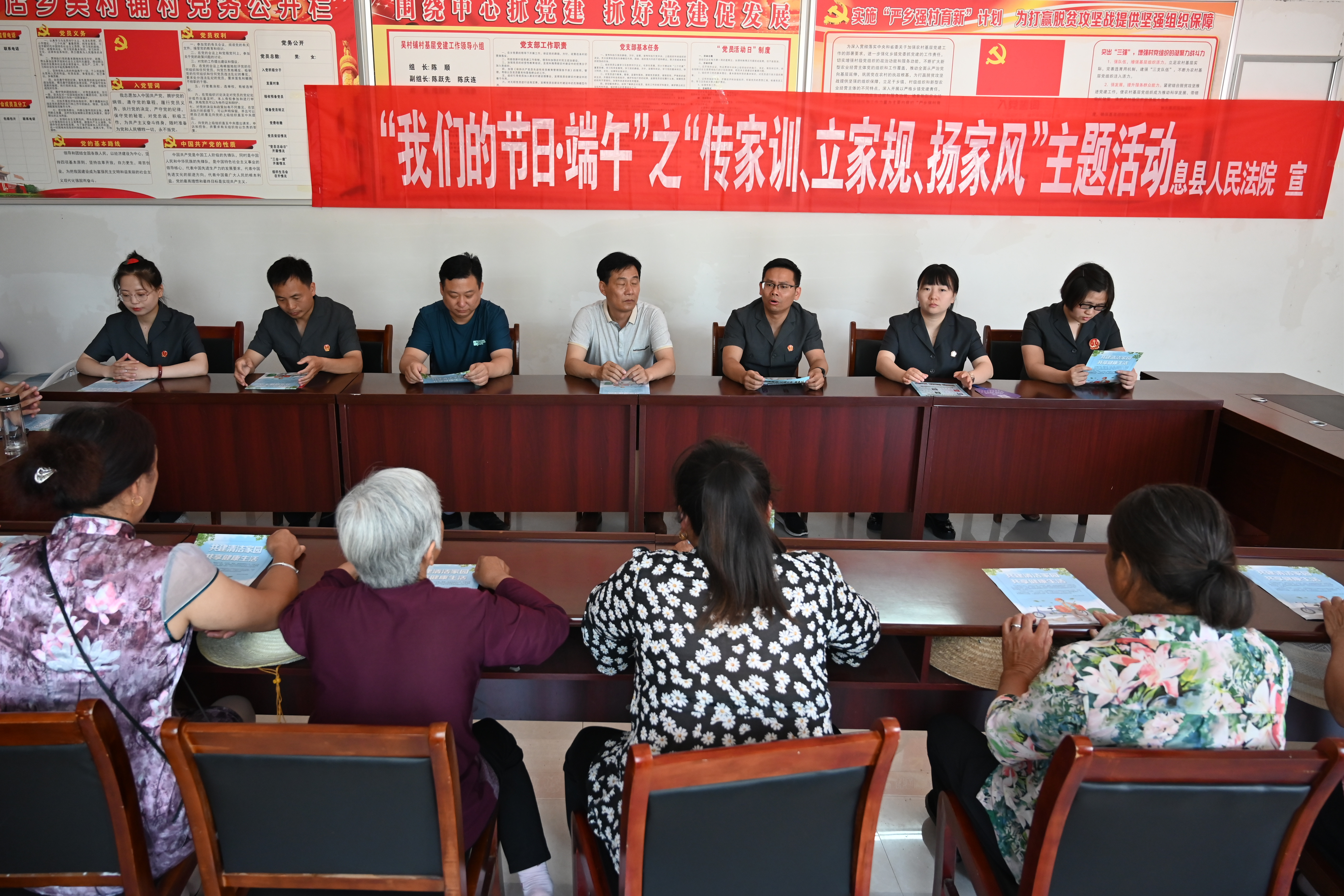6月9日,息县法院干警走入关店乡吴村铺村,开展“我们的节日•端午之‘传家训、立家规、扬家风’”活动。关店乡吴村铺村干部及部分村民参加活动。