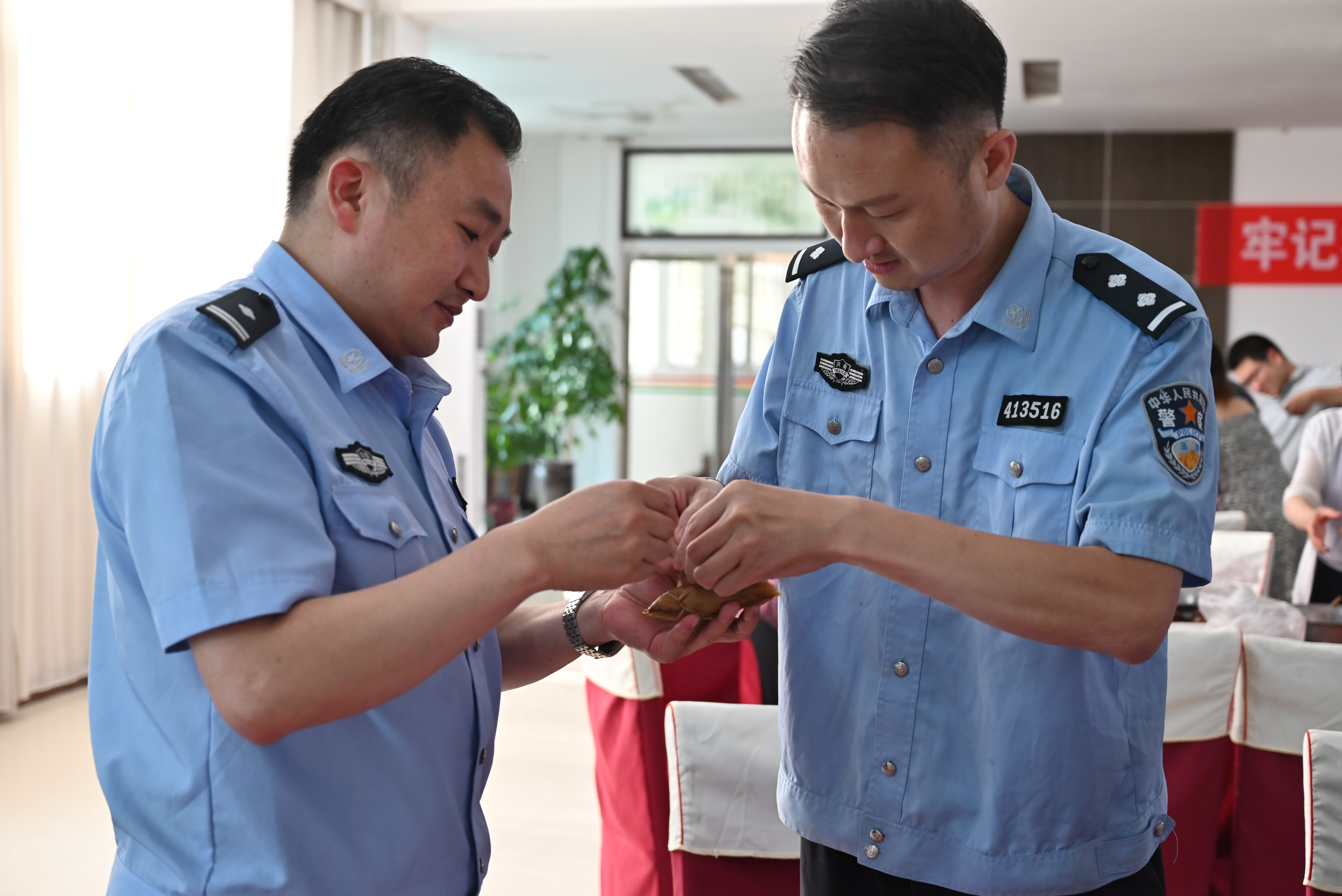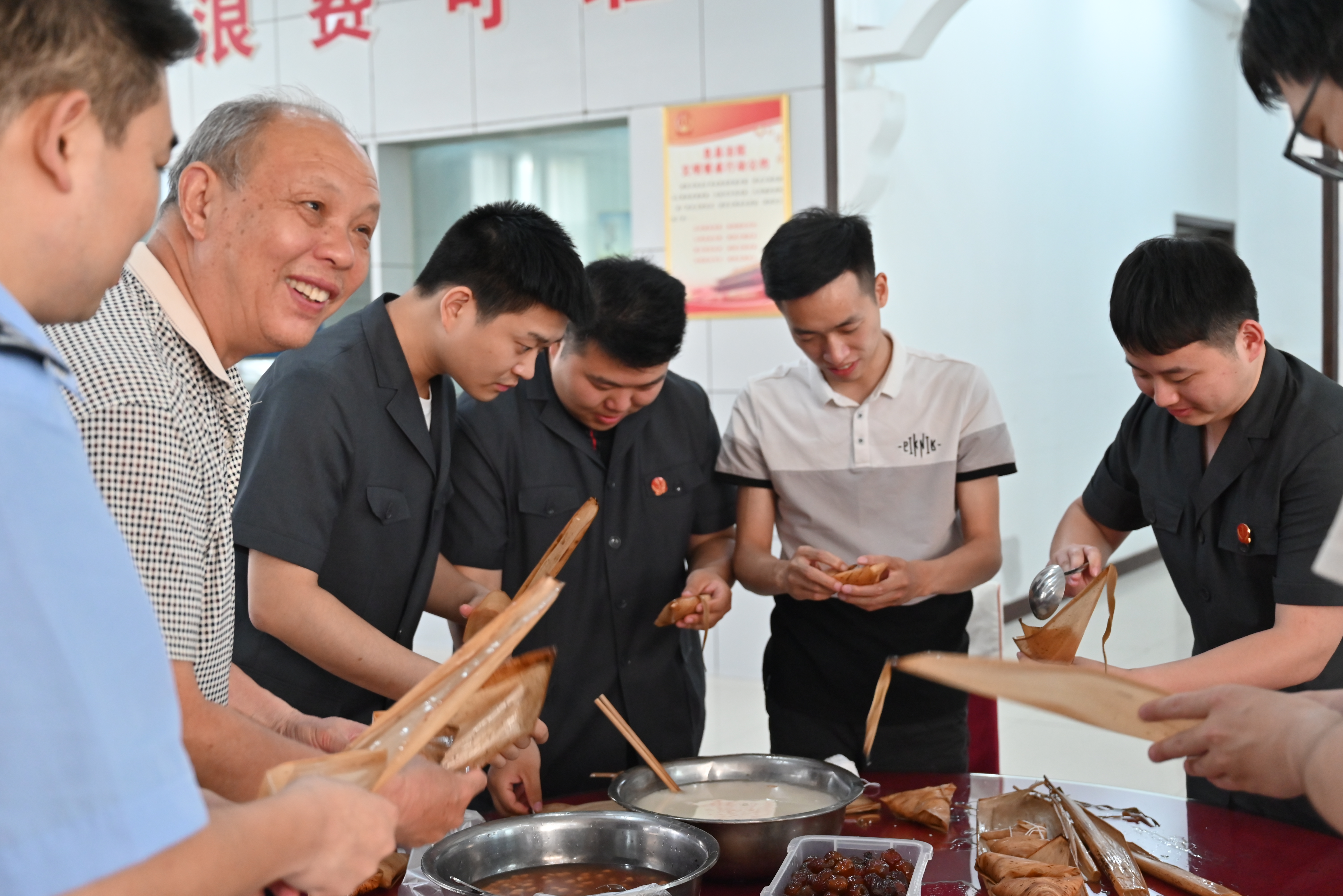 活动现场,干警们互相学习如何折粽叶,怎样扎绳子。有技巧娴熟的老行家一会功夫已经包好一小排,而生涩笨拙的小新手还在研究怎么扎绳才不会漏米。“你看,这样先窝一个角,顺着包住,包紧了哈……”,高手们现场教学,“小菜鸟”们虚心求教,大家通力合作,不一会儿,桌上就堆满了各式各样、大小不一的粽子。