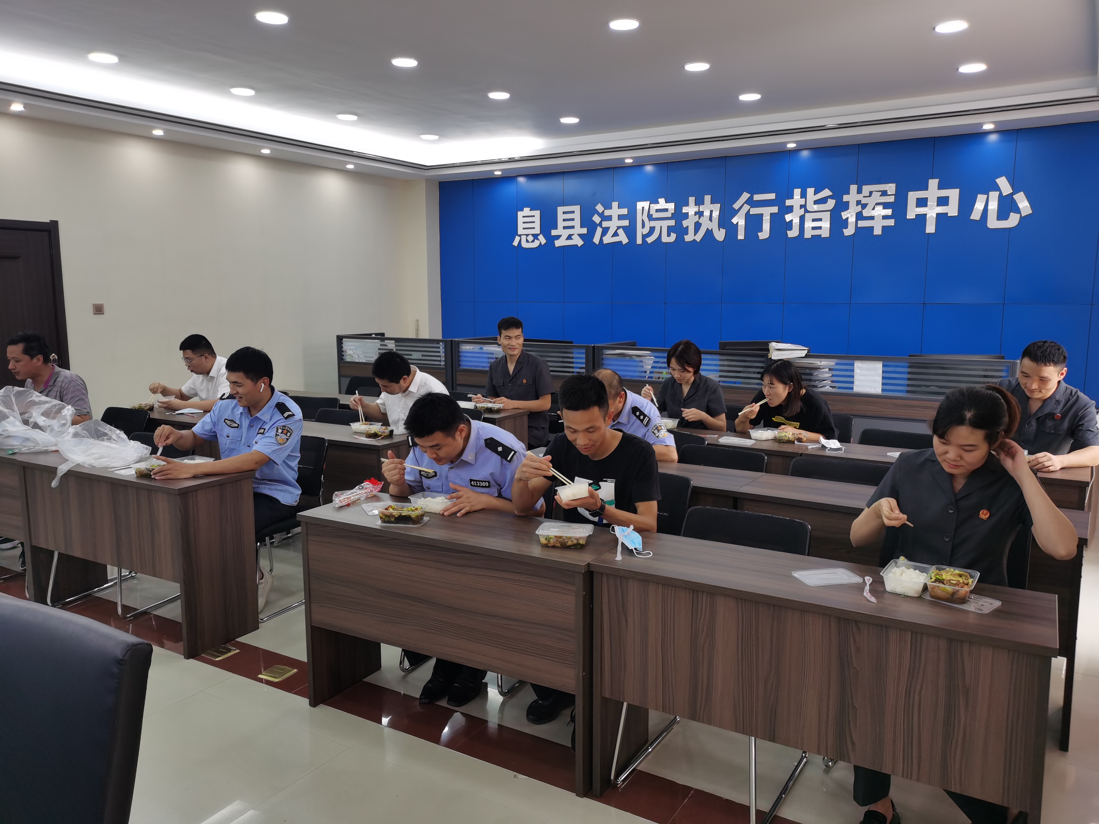 中午近一点,从早上六点就开始忙活的执行干警们终于吃上了一口热饭。在执行指挥中心,他们一边看守被执行人,一边扒拉几口热饭,也算是短暂休息。