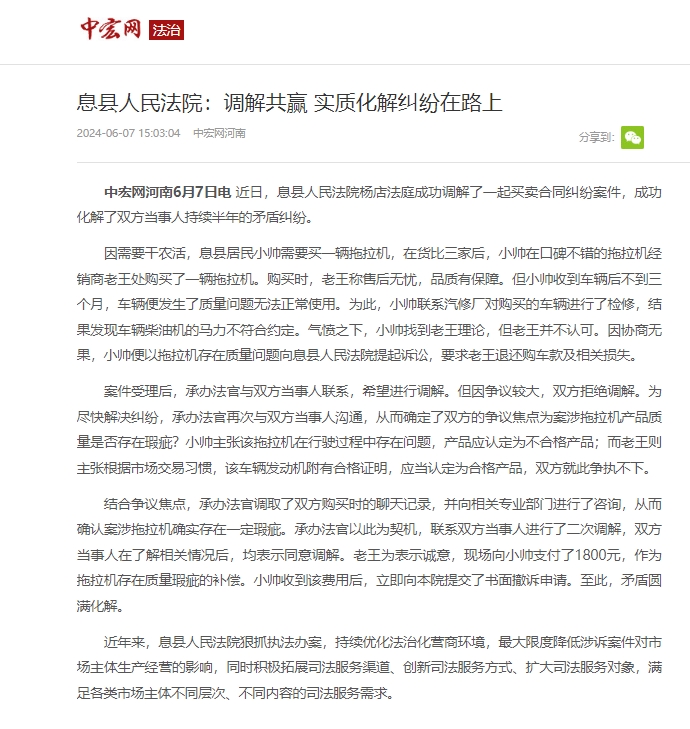 近日,息县人民法院杨店法庭成功调解了一起买卖合同纠纷案件,成功化解了双方当事人持续半年的矛盾纠纷。