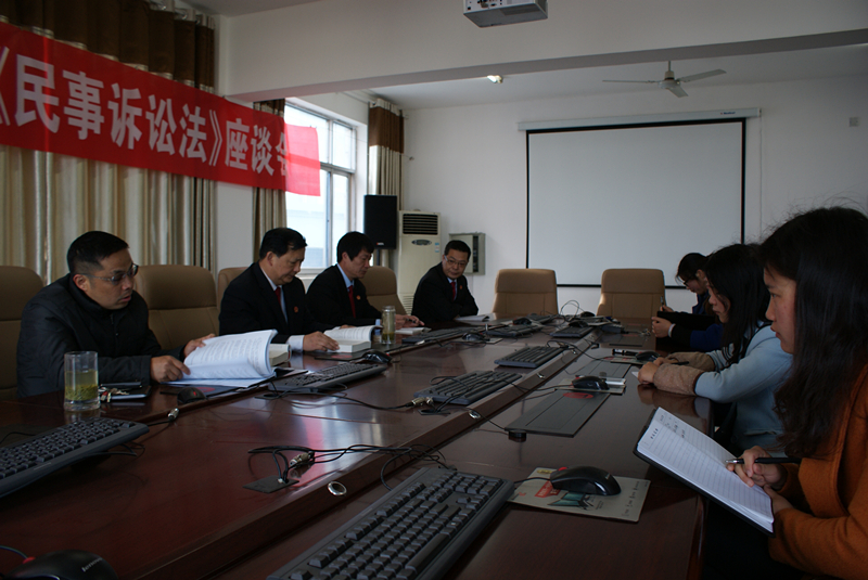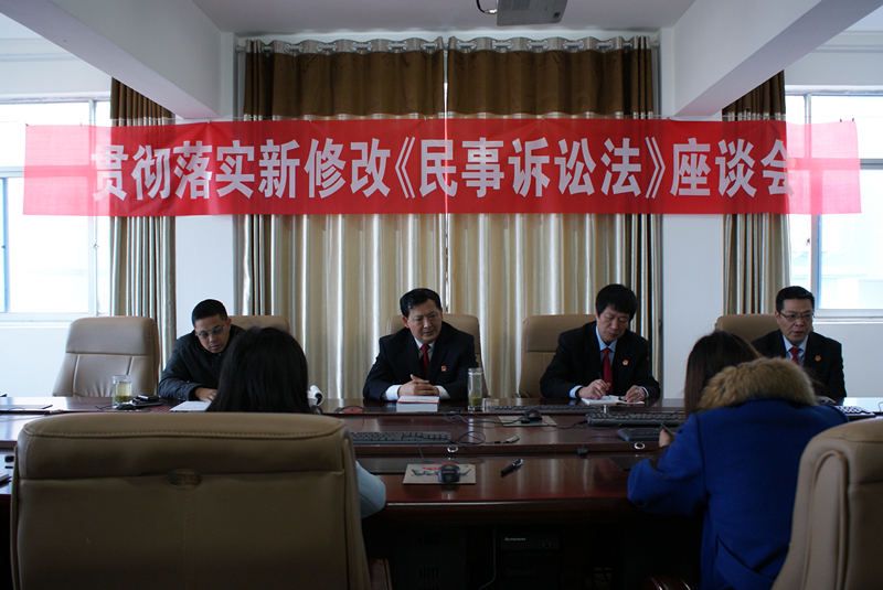 座谈会上,民事审判一庭庭长徐无己宣读了关于学习贯彻落实《最高人民法院关于适用<中华人民共和国民事诉讼法>的解释》的通知,并就新司法解释实施过程中需要重点学习应用的条款、法定情形等进行了讲解。该院主管民事审判工作的李政刚副院长要求民事审判业务口的同志们认真学习,与时俱进,实事求是地将新法学到位,用到位,依法办案,切实履行法律职责。参加学习的法官表示,要继续深入学习,把新法精神吃深吃透,严格规范公正司法,依法有效地保障当事人的诉讼权利。