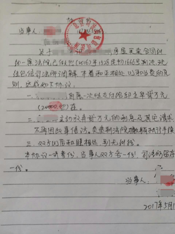 2016年8月邱某将杨某诉至法院,并于2017年4月申请了强制执行。杨某得知此事后,于5月18日同杨某一起找到当地司法所两人签订了协议书,杨某将20000元欠款还上,并到执行局办理了结案。