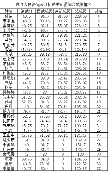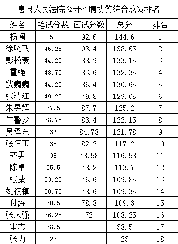 息县法院2017年公开招聘书记员、协警综合成绩公布